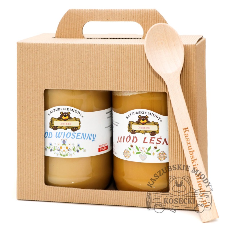 Miód leśny, miód wiosenny i drewniana łyżka do miodu zapakowane są w piękny, karbowany kartonik, który przyciąga wzrok. Opakowanie to posiada okienko, gdzie obdarowany od razu widzi jakie miody otrzymuje, a rączka kartonika sprawia, że prezent łatwo i wygodnie można przenosić.
